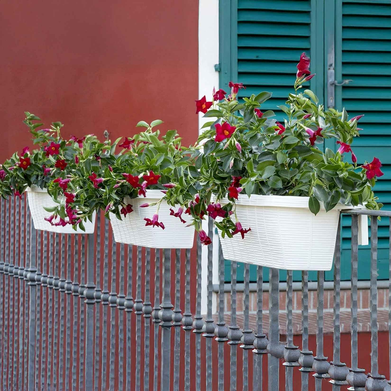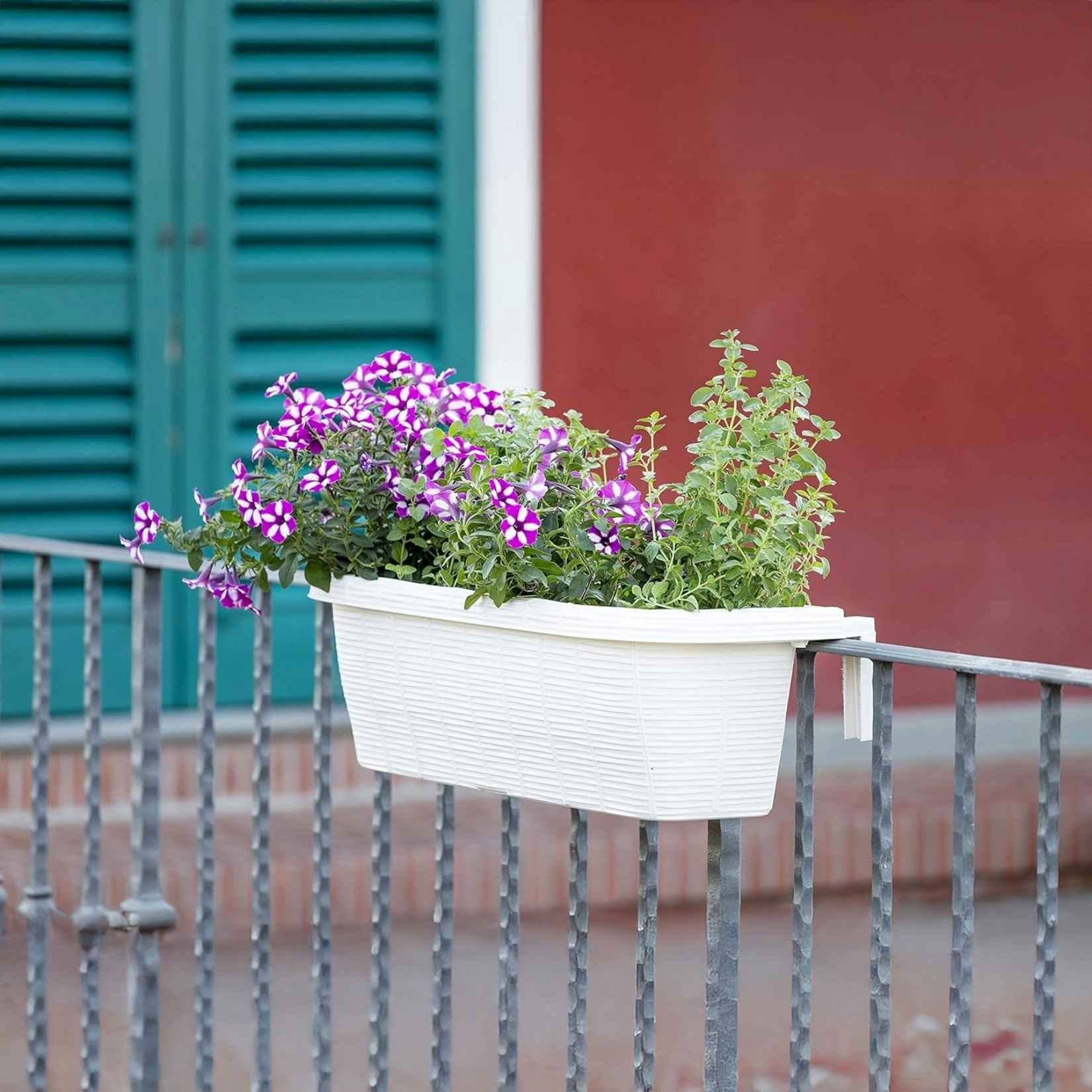 Der cremefarbene Blumentopf Rondine Bama verleiht Balkonen und Terrassen eine raffinierte, natürliche Note. Dank der verstellbaren Haken lässt er sich leicht an verschiedene Geländertypen anpassen, während das Wasserreservoir die Bodenfeuchtigkeit aufrechterhält und so das Pflanzenwachstum fördert.