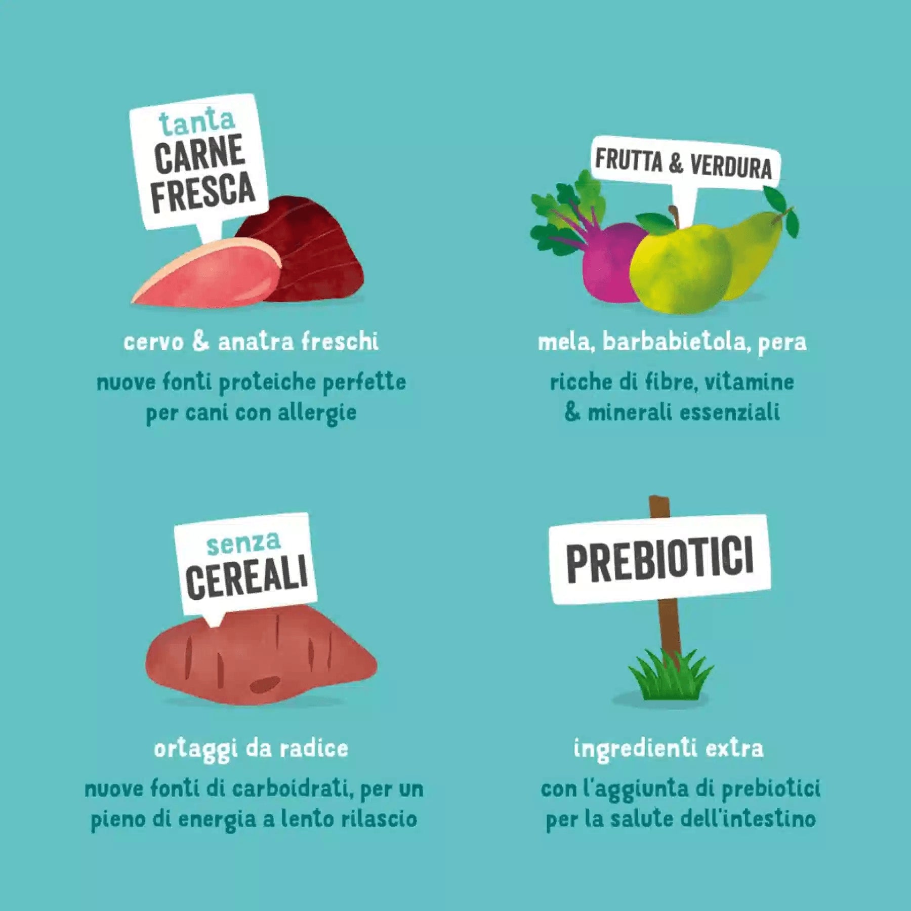 - Hauptzutaten: **Frisches Wild, Freilandente, Süßkartoffeln, Erbsen, Leinsamen**.