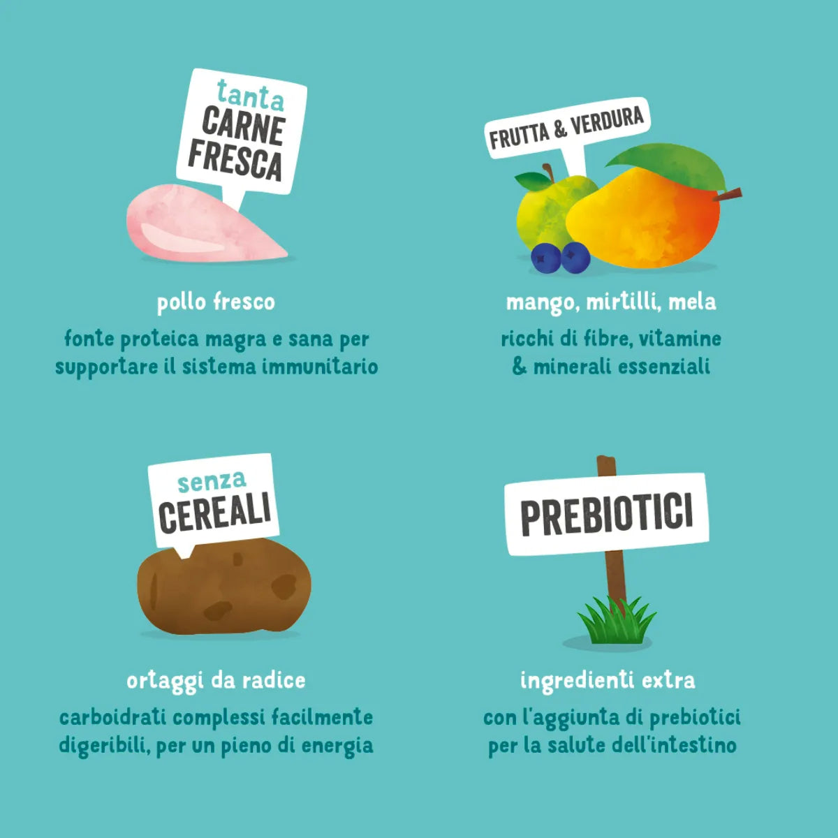 | Hauptzutaten | Frisches Hühnchen, Kartoffeln, Erbsen, Leinsamen, Fischöl |
