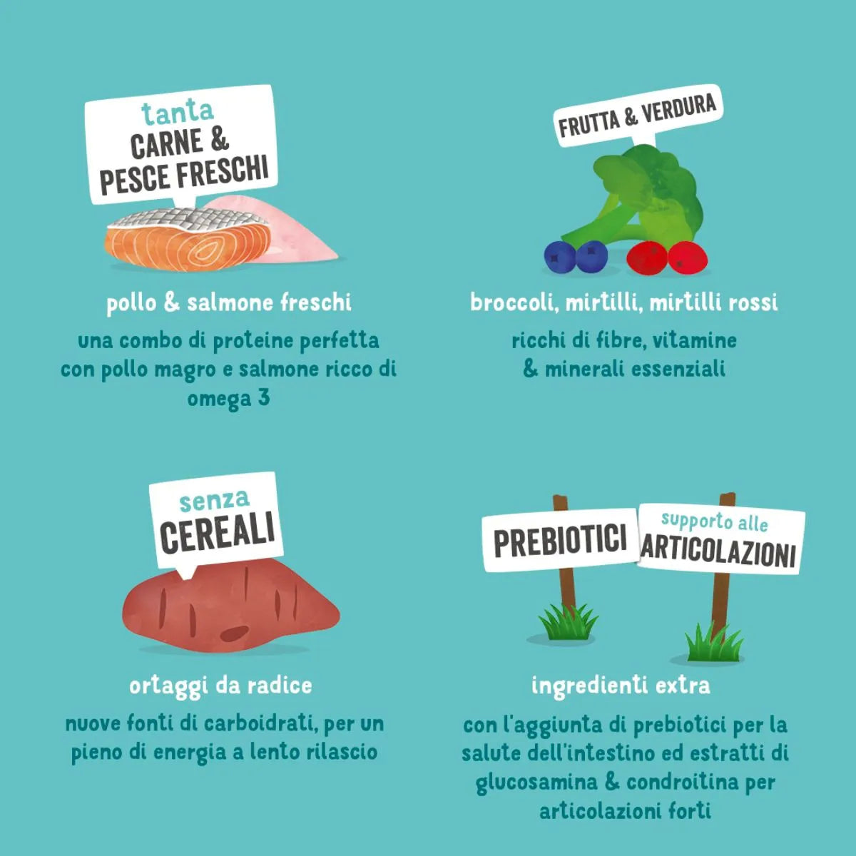 - Hauptzutaten: **Frisches Hühnchen, frischer Lachs, Süßkartoffeln, Erbsen, Leinsamen**.