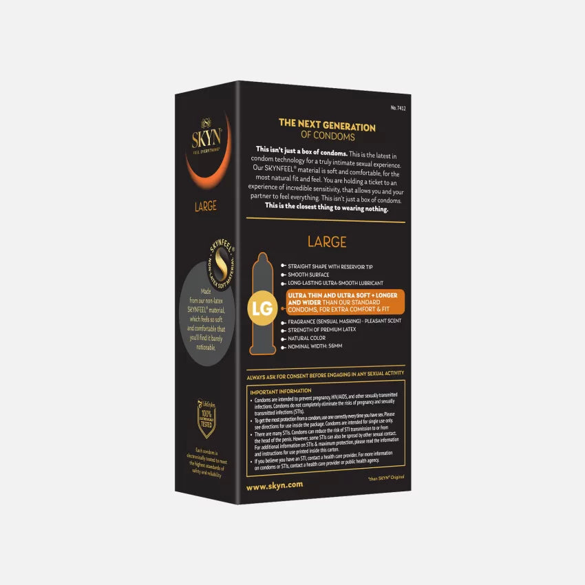 SKYN® Large ist eine Packung mit 48 latexfreien Kondomen aus SKYNFEEL® , einem innovativen Material auf Polyisoprenbasis, das eine