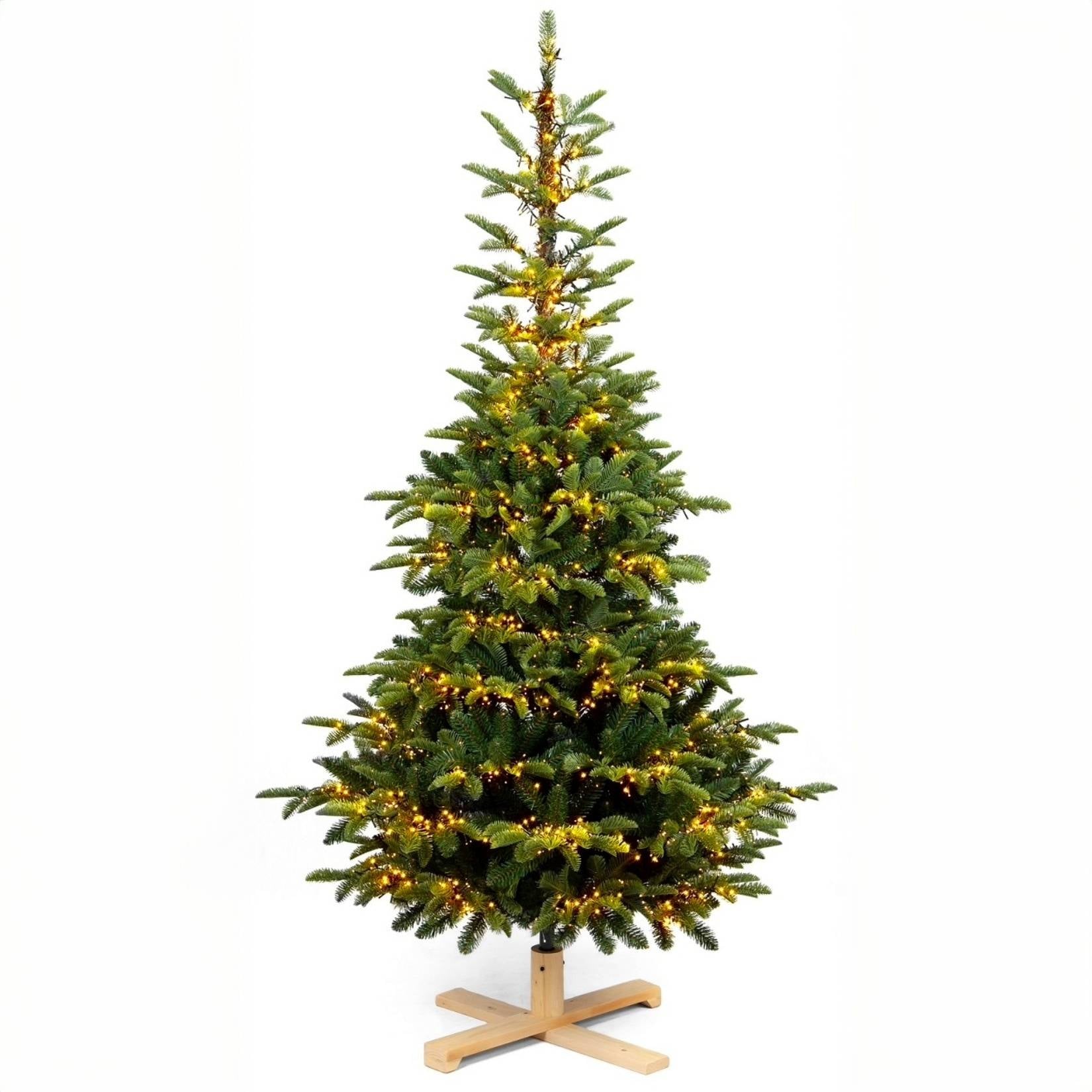 Albero di Natale 210 cm Modello Samu con Luci LED Calde e Base in Legno – 731 Rami Realistici in PE+PVC, Ø111 cm, Montaggio Ombrello e Giochi di Luce